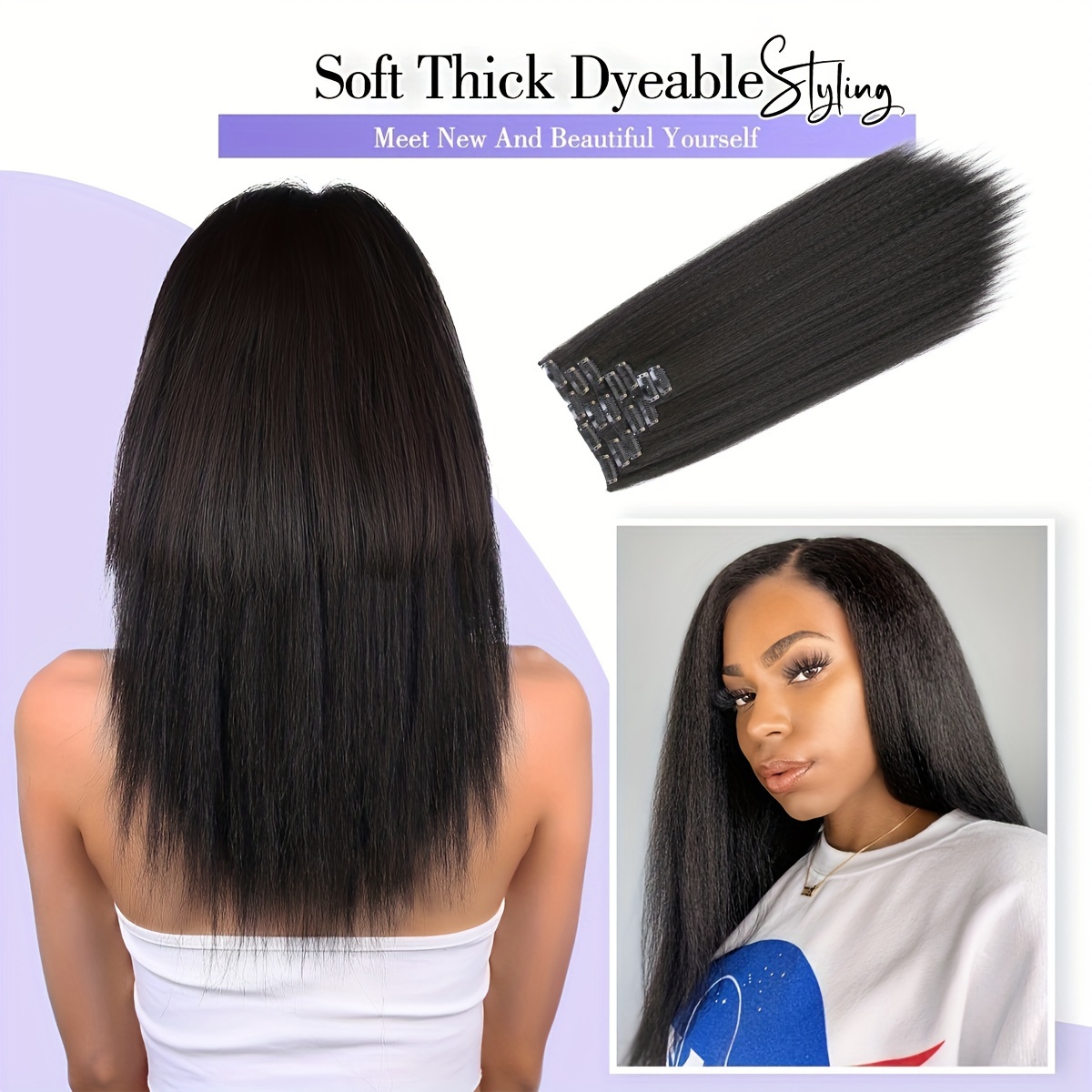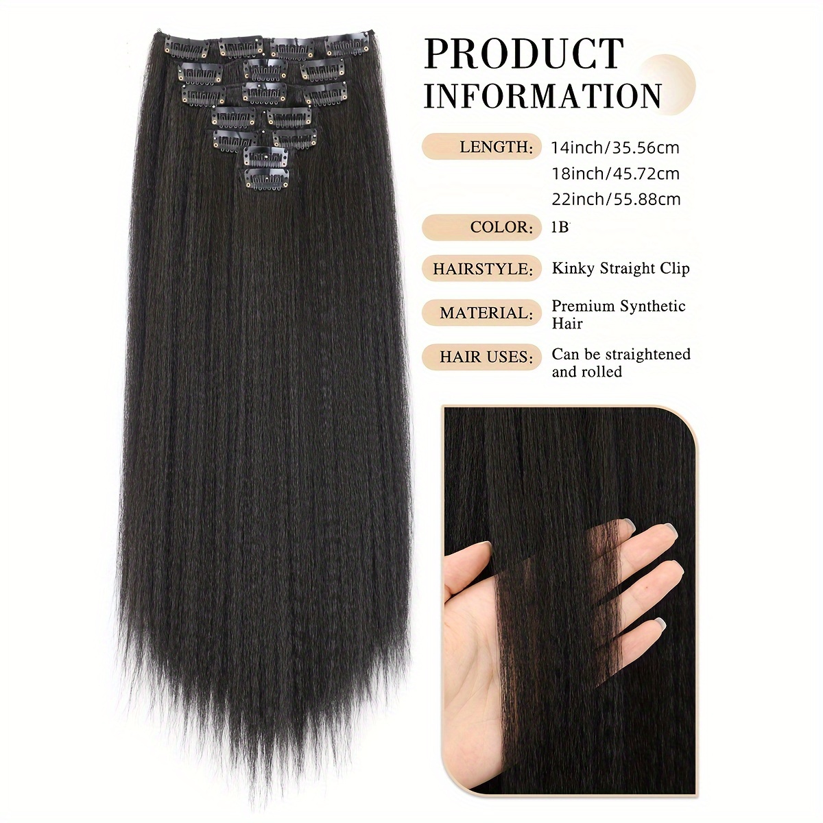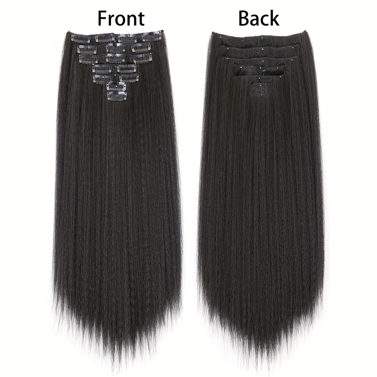 7pcs Kinky Straight Clip-In Hair ExtensionsFull Head Yaki Synthetic Black Hair, 22 Inch With 16 Clips, Tangle-Free, Shedding-Free, Shiny, Healthy, No Spilt Elasticity, 7pcs Kinky Straight Clip-In Hair Extensions, Synthetic Black Hair$25.20PriceColorSelectHair LengthSelectQuantity*Add to Cart